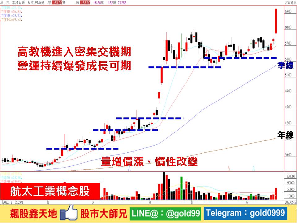 【操作建議】「低接不追高」原則不變,賀!從二月份低檔38元鎖定推薦分享的漢翔,6/19亮燈漲停再創新高,已來到63.9元,隨著量增價漲、短中長期均線呈現多頭排列向上,以及多方控盤格局不變下,只要量價不失控,並守穩6/15的54.7元低點不破,逢低仍值得留意,預期後市仍將有續漲再創新高的機會(※基本面資料若有異動,依公開資訊觀測站最新訊息為主)。基於風險考量,設好停損停利(詳見附圖說明)。
