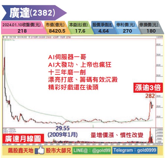【操作建議】「低接不追高」原則不變,受美國擴大對中國大陸AI晶片禁令管制衝擊,股價出現漲多拉回整理走勢,隨著利空逐步淡化,加上輝達給力、AI PC商機來臨,今年營運爆發大成長可期,且股價於低檔整整打底十三年時間,籌碼有效沉澱,輝達所掀起的AI浪潮才剛起步,真正的好戲還在後頭。