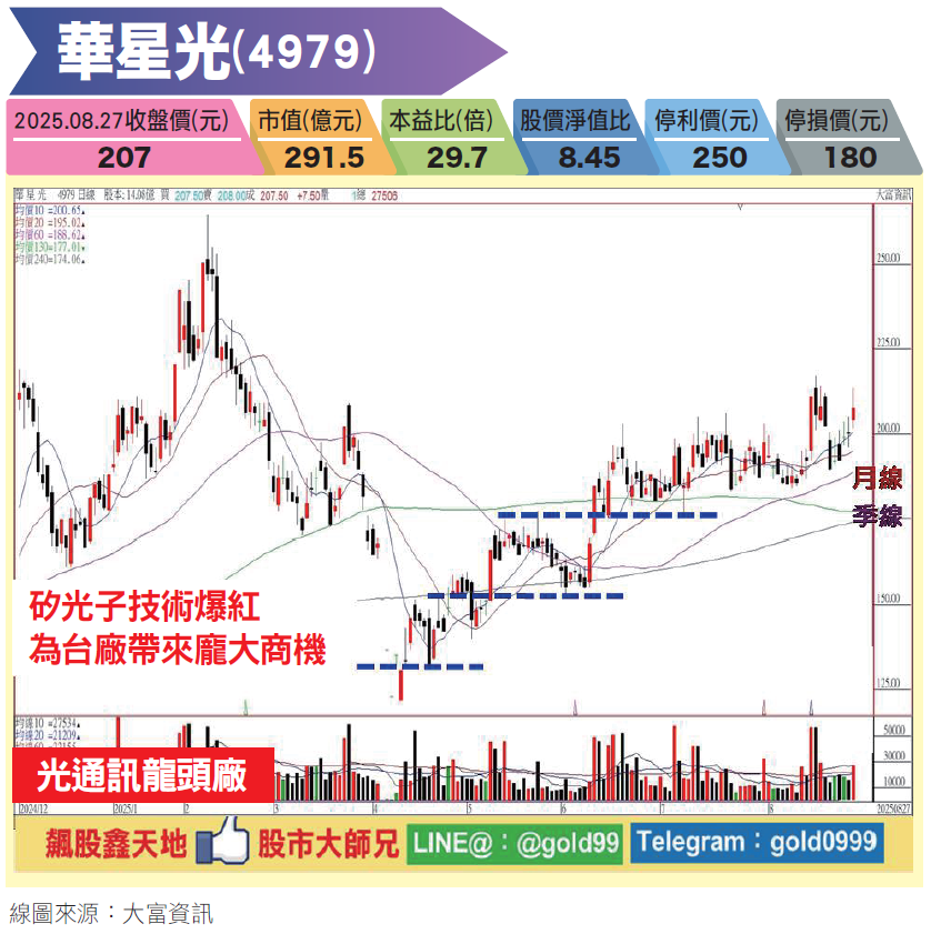 (1)AI光通訊題材再獲法人青睞:華星光專注於光通訊主動元件,產品線涵蓋VCSEL、DFB雷射、800G高速模組等,受惠於資料中心升級與AI伺服器需求,營收持續創新高,上半年EPS 2.19元,七月合併營收3.88億元,月增8.96%、年增28.57%,累計今年一至七月營收25.43億元,年增44.53%,優於市場預期。