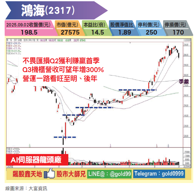 【個股推薦】鴻海(2317),全球最大電子製造服務(EMS)廠商。2021年成立研究院,切入應用領域為人工智慧、5G通訊、量子運算、半導體、資通運算等。2025年7月,公司與東元策略聯盟增資換股,預計第四季完成交易,交易完成後,鴻海將成為東元第二大股東。主要利基題材有: