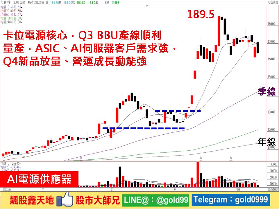 (2)BBU第三季量產,AI伺服器及ASIC客戶需求強勁,第四季新品放量:BBU(Battery Backup Unit)電池備援系統可提供AI資料中心短時間的停電保護,為部署AI伺服器必備基礎設施,光寶科客戶包含美國雲端服務供應商(CSP)等需求強勁,美國、台灣兩地BBU產線於第三季量產,推升營運走強。