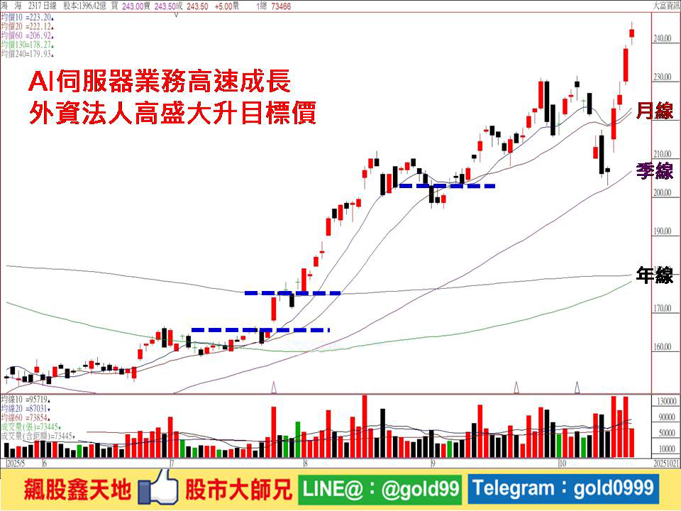 (3)外資法人提高鴻海目標價:高盛證券指出,鴻海AI伺服器業務高速成長,加上摺疊手機趨勢,已漸成為AI及高階電子產品製造核心供應商,看好未來長期成長動能,予以「買進」建議,並提高目標價至400元。