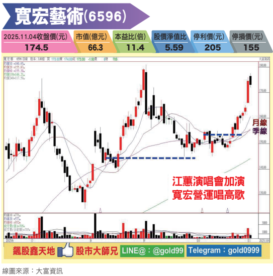 (1)天后加持,營運報喜:寬宏藝術為國內最大藝文展演主辦業者,2025年上半年營收8.51億元,歸屬母公司業主淨利2.36億元,年增143%,已超越去年全年的2.09億元,EPS 6.21元,主要受惠第二季認列多場國內外演唱會、舞台劇、音樂劇及馬戲團表演等活動收入。